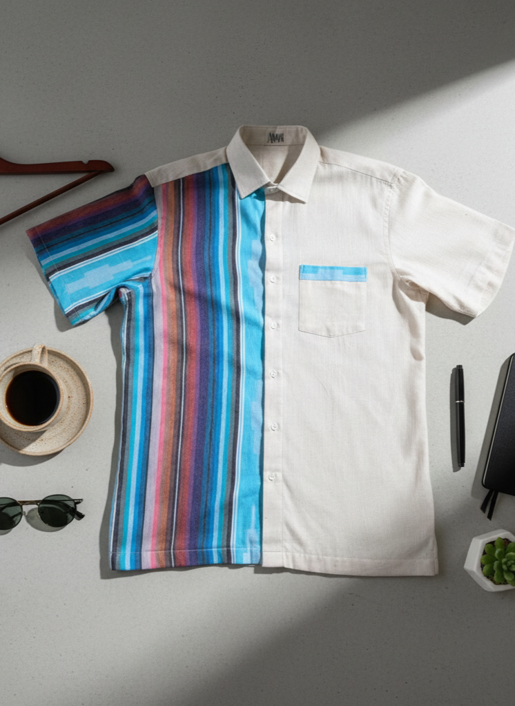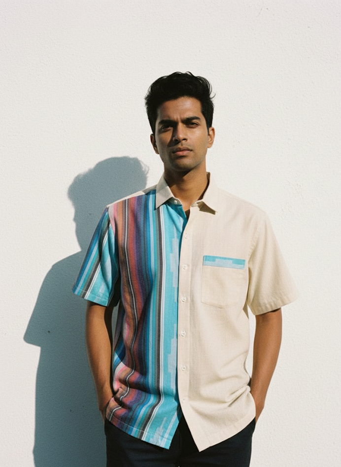 The Jamakalam Stripe Shirt reimagines traditional South Indian weaves in a modern silhouette. Crafted from surplus cotton, its bold vertical stripes and hand-finished details bring together color, comfort, and quiet confidence.
