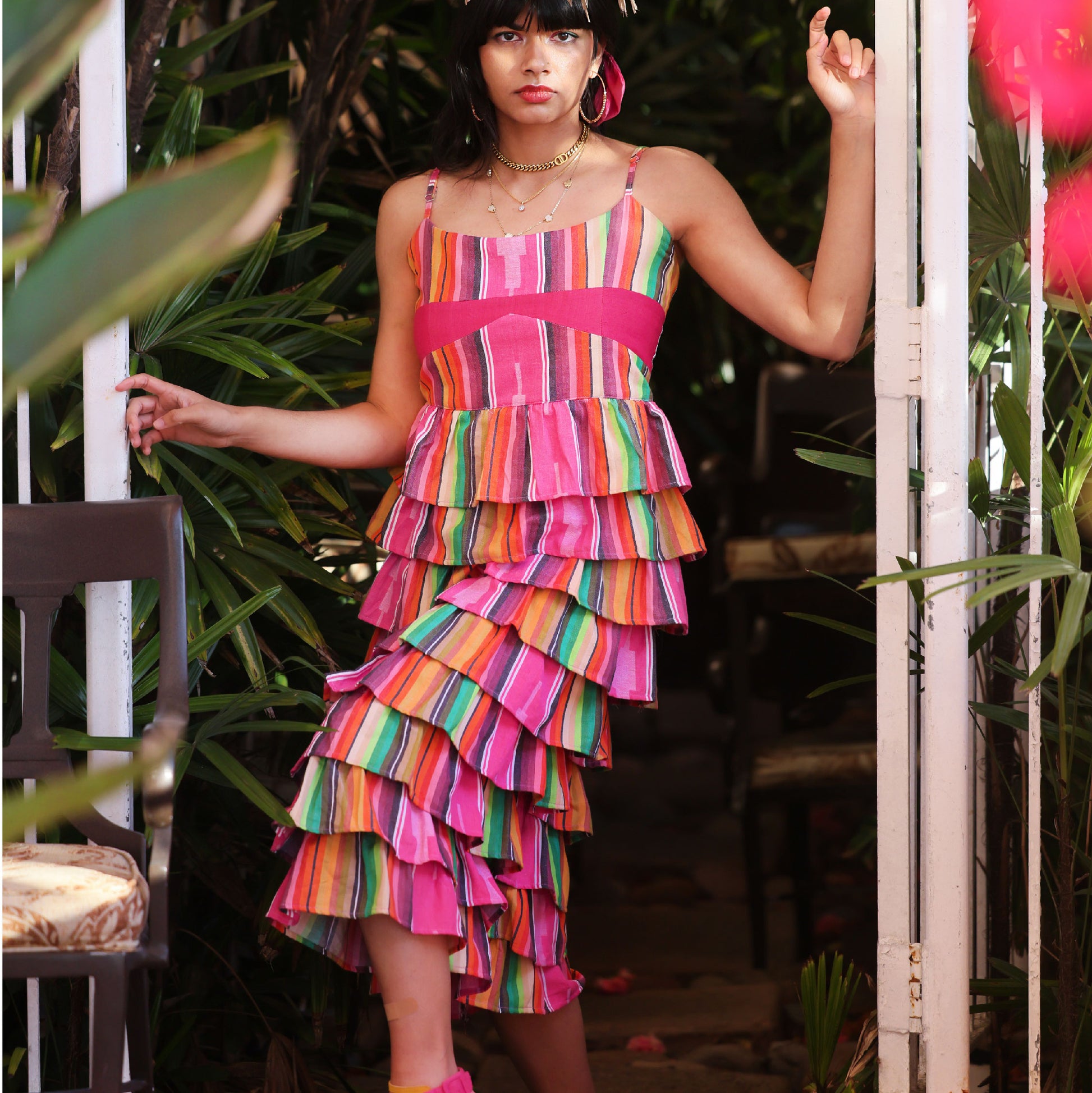 Add vibrant flair to your wardrobe with the Jamakalam Stripe Tiered Ruffle Dress from Aivari.co. Inspired by traditional South Indian Jamakalam weaves, this playful dress features bold, multi-colored stripes and cascading ruffled tiers for a statement silhouette. Crafted from surplus materials for truly sustainable style, it flows elegantly whether dressed up or down. Comfortable, eye-catching, and consciously made—bring a touch of heritage craftsmanship to your modern looks.